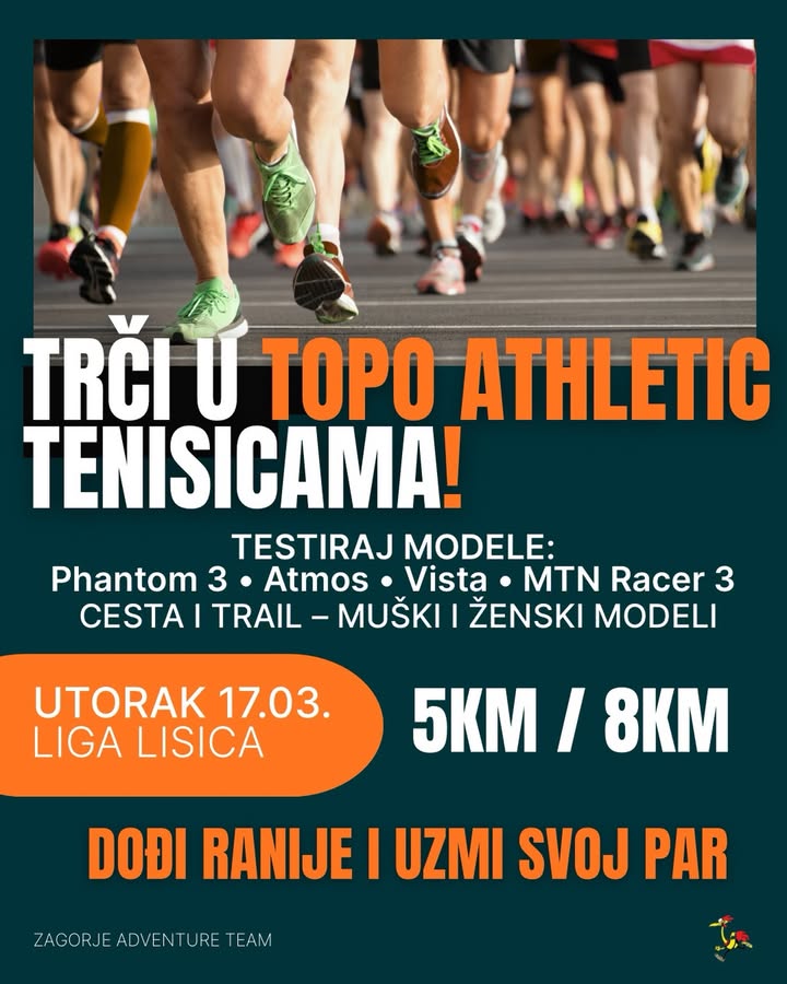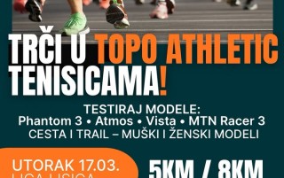 U goste nam dolazi @topoathletic pa ćemo imati Test Run njihovih tenisica. Na raspolaganju će biti cestovni modeli Phantom 3 i Atmos, kao i trail modeli Vista i MTN Racer 3 — za sve koji žele isprobati kako se ponašaju na stazi.